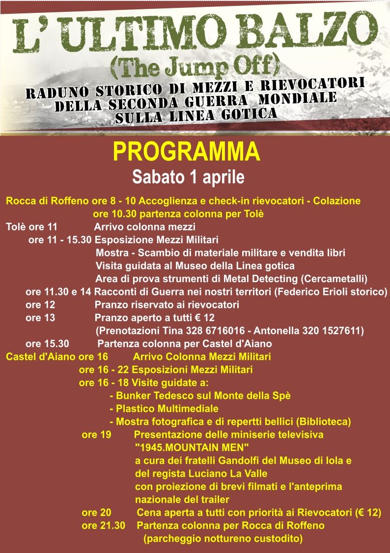 80 rievocatori, 34 mezzi militari, un carro armato Sherman dell’esercito americano e 4 comuni dell’Appennino bolognese. Sono alcuni dati che caratterizzano la prima edizione de l’Ultimo Balzo, il raduno storico che sabato 1 e domenica 2 aprile vivacizzeranno le strade di Castel d’Aiano, Cereglio, Rocca di Roffeno e Tolè. (leggi l’articolo)