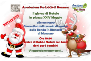 Monzuno “il giorno di Natale in piazza XXIV maggio” dalle ore 10,00 concertino della scuola di musica della Banda P.Bignardi di Monzuno a seguire arriva Babbo Natale tanti tanti doni per i bambini.