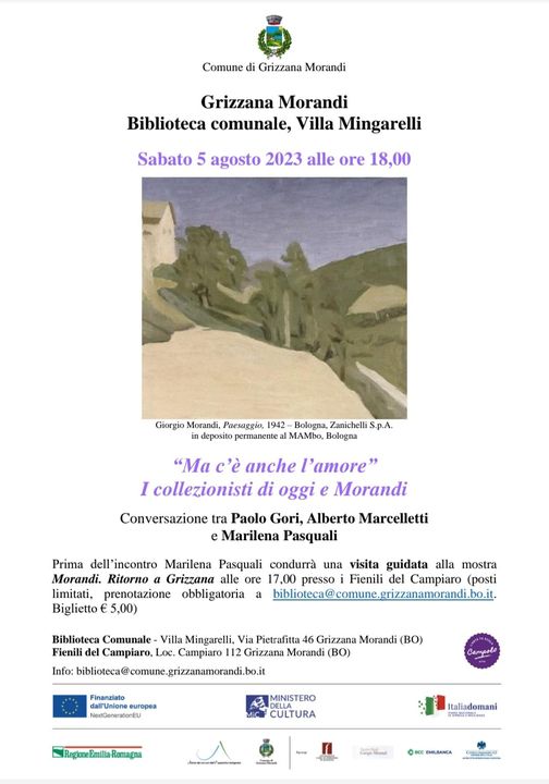 Alle ore 18 a Villa Mingarelli, sempre a Grizzana “Ma c’e’ anche l’amore” i collezionisti di oggi e Morandi. Conversazione tra Paolo Gori, Alberto Marcelletti e Marilena Pasquali