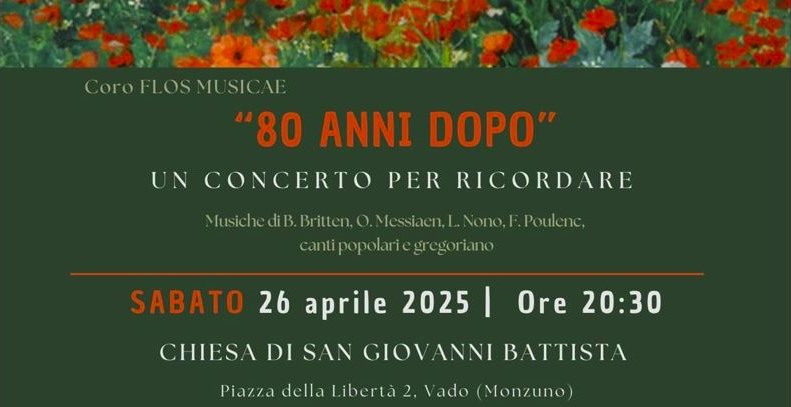Sabato 26, a Vado, nella chiesa di San Giovanni Battista si esibirà il coro Flos Musicale in “Concerto per ricordare”. Il concerto è reso possibile dal contributo del Comitato Onoranze ai caduti di Marzabotto. Vedi locandina.