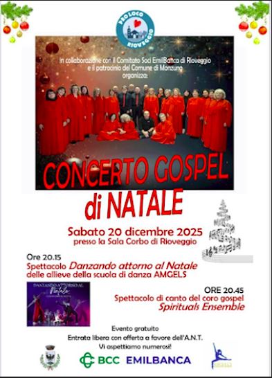 La Pro Loco di Rioveggio, in collaborazione con il Comitato Soci EmilBanca locale e con il patrocinio del Comune di Monzuno, organizza per sabato 20 dicembre 2025 un Concerto Gospel di Natale presso la Sala Corbo, una delle sedi culturali più attive del territorio.