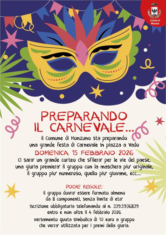 Il Comune di Monzuno è lieto di annunciare una grande festa di Carnevale che si terrà domenica 15 febbraio in Piazza della Libertà a Vado a partire dalle ore 14:00.