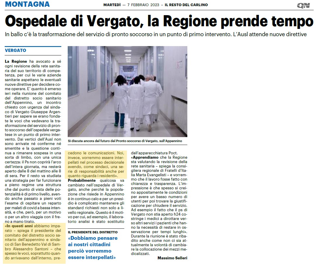 Alessandro Santoni, sindaco di San Benedetto Vds, e Presidente del Distretto socio-sanitario di garanzia e committenza dell’Appennino bolognese scrive in merito a “Ospedale di Vergato e Auto mediche 118