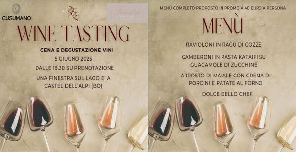 All’Hotel Ristorante Bar “Una Finestra sul lago” di Castel dell’Alpi, giovedì 5 giugno cena con menù degustazione vini