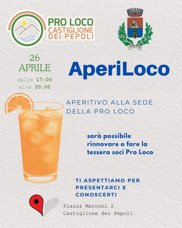 - Sabato 26 aprile, dalle ore 17:00 alle 20:00, presso la sede della Pro Loco in Piazza Marconi 2: un’occasione per incontrarci, rinnovare la tessera e trascorrere insieme un piacevole aperitivo.