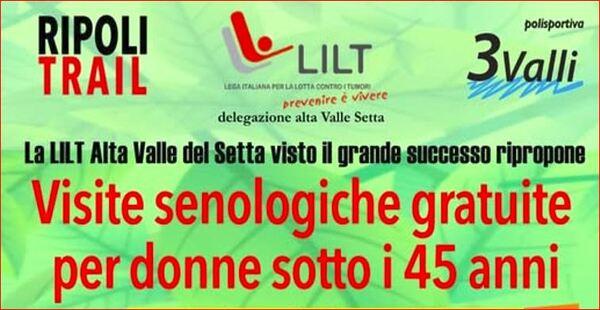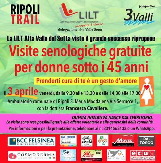 Dopo il grande successo della prima iniziativa del 10 marzo, LILT Alta Valle del Setta, Ripoli Trail e Polisportiva Tre Valli ripropongono le visite senologiche con ecografia dedicate alle donne sotto i 45 anni.