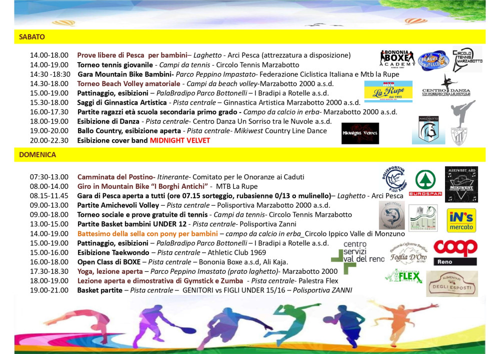 Due giorni nella verde cornice del Parco Bottonelli di Marzabotto con tornei di Basket, Pallavolo, Tennis, Calcio, Pesca e Boxe. Non mancheranno inoltre le esibizioni di Pattinaggio, Ginnastica Artistica, Danza, Taekwondo e, dopo qualche anno di assenza, torna il Battesimo della Sella per più piccoli, ovvero un giro a cavallo su uno splendido Pony.
