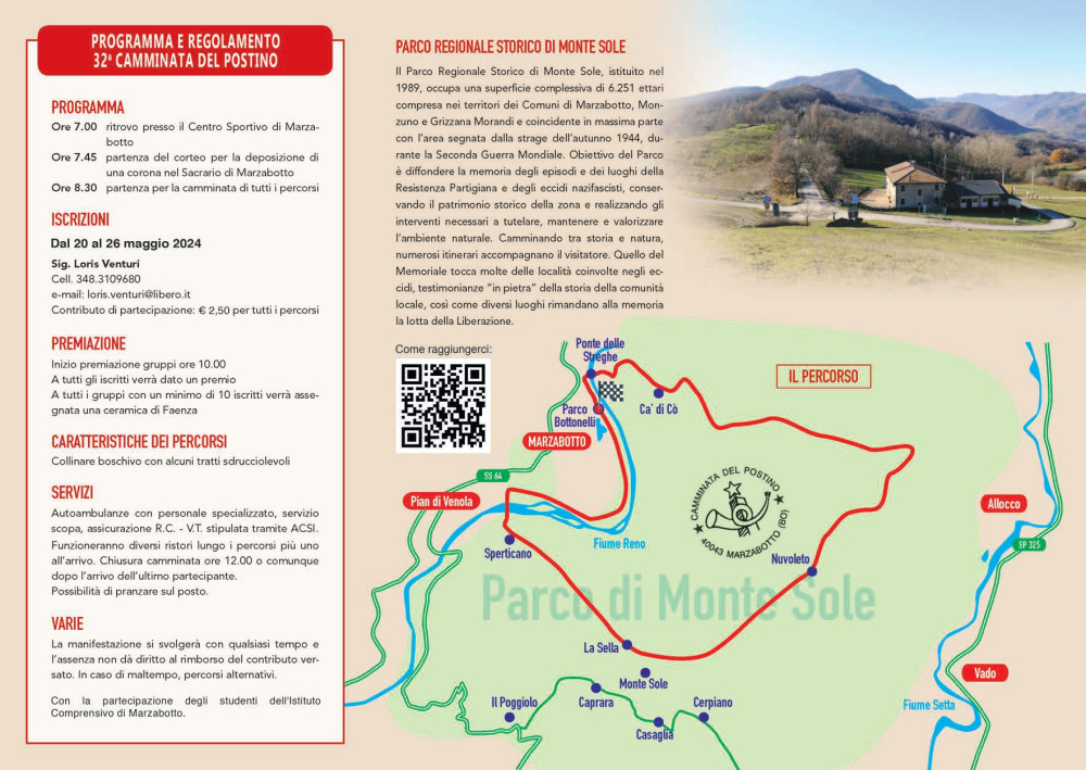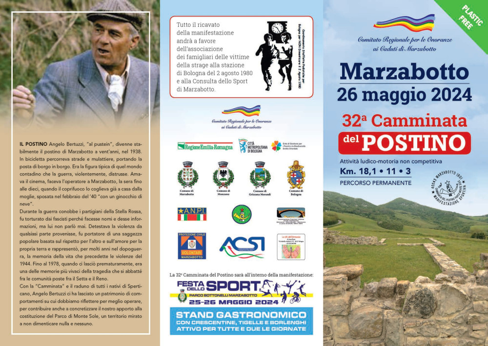 L’evento più atteso, per la grande partecipazione che ha sempre riscontrato, è la 32° Camminata del postino, con le partenze domenica mattina dei tracciati da 8 e 18 km tutti sviluppati nel parco storico di Monte Sole, per ripercorrere le tracce del “Postino” Angelo Bertuzzi, quest’anno eccezionalmente previsto con una modifica al percorso che porterà fino al Cippo del Monte Sole.