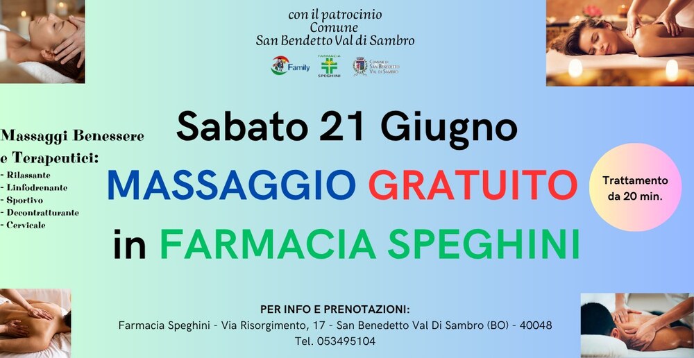 Vedi anche “PROGETTO CUORE”. Con il patrocinio del Comune di San Benedetto Val di Sambro, la Farmacia Speghini propone “Giornata di massaggi Benessere e terapeutici”.