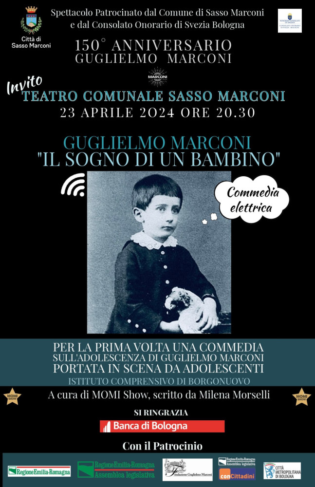 Sasso Marconi. Spettacolo teatrale “Guglielmo Marconi, il sogno di un bambino”, martedì 23 aprile al Teatro Comunale