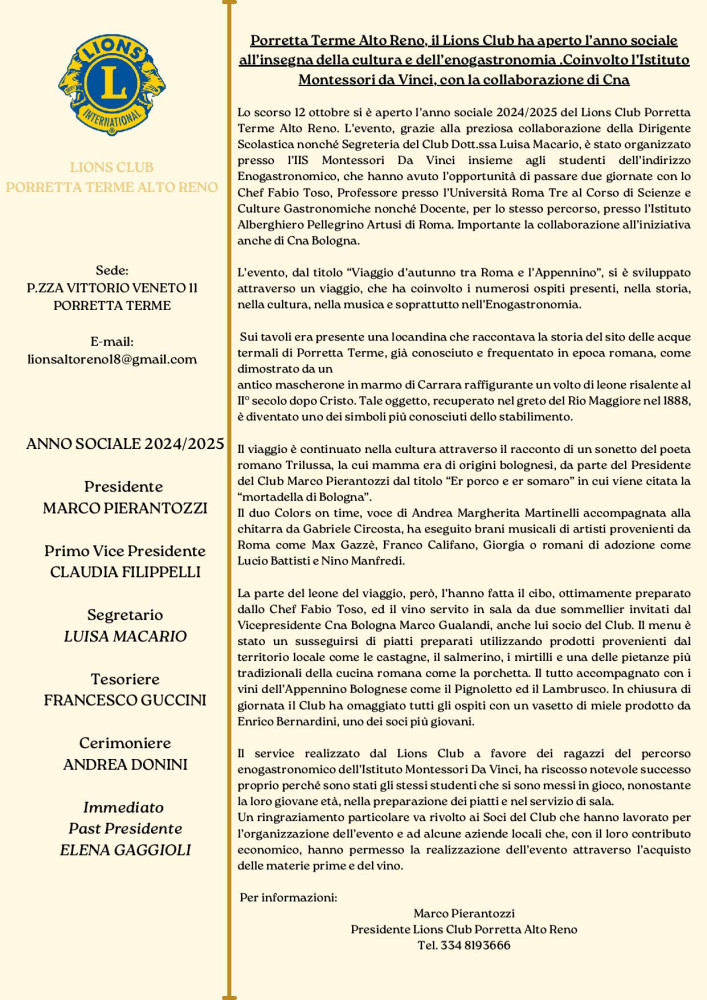 Porretta Terme Alto Reno, il Lions Club ha aperto l’anno sociale all’insegna della cultura e dell’enogastronomia .