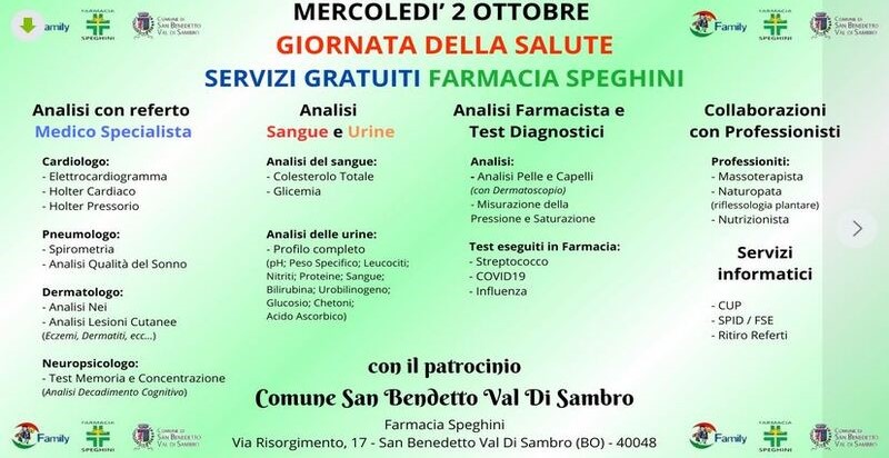 Il Comune di San Benedetto Vds, patrocinante l’evento comunica: Il prossimo mercoledì 2 ottobre sarà possibile effettuare una serie di visite gratuite a scopo preventivo presso la FARMACIA SPEGHINI di San Benedetto Val di Sambro. Vedi quali esami in allegato.