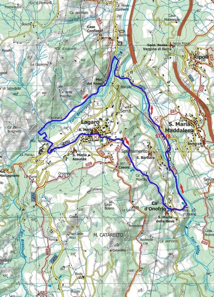 Continuando il percorso troverete il paese di Lagaro, dove sarà sistemato il primo ristoro e con una piccolissima deviazione si potrà ammirare lo splendido BORGO VECCHIO poi Ca’D’Onofrio dove trovate un oratorio dedicato alla Madonna della Neve risalente al 1600. Ivi sarà presente il secondo ristoro. Oramai giunti alla fine del percorso attraverseremo Spianamento, paese nato al tempo dei lavori della direttissima Bologna Firenze,ritorneremo poi alla stazione di San Benedetto val di Sambro-Castiglione dei Pepoli dove vi verrà offerto un ottimo panino con la mortadella appena affettata da gustare con tranquillità.