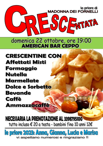 Le priore di Madonna dei Fornelli, ci invitano all’American Bar Ceppo per una crescentata alle ore 19 di domenica 22