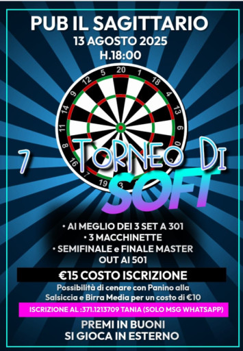 Montefredente. Mercoledì 13 agosto presso il Pub Il Sagittario, “Torneo di freccette Soft”. Vedi info in allegato