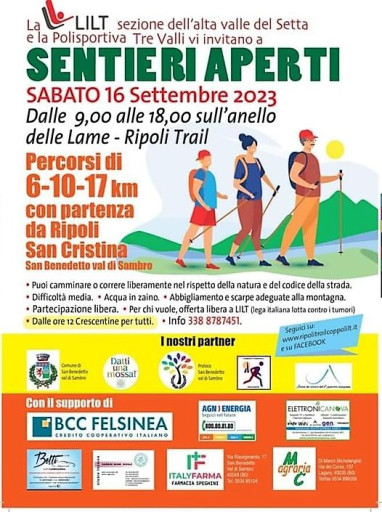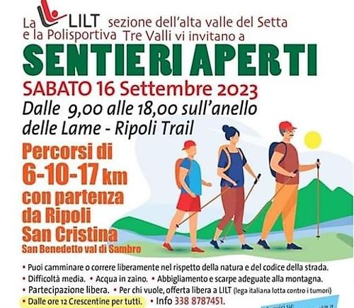 A cura della LILT delegazione Alta Valle del Setta e della Polisportiva Tre Valli, il 16 settembre prossimo, a Ripoli Santa Cristina, frazione di San Benedetto Val di Sambro, avverrà l’inaugurazione di Sentieri Aperti”.