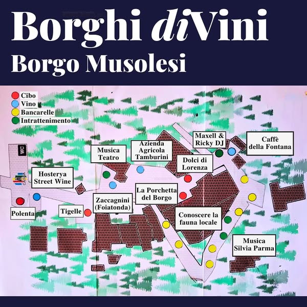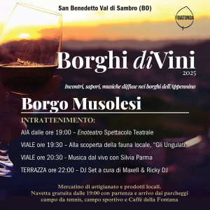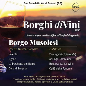 Borghi diVini torna a Borgo Musolesi con le cantine locali e i loro deliziosi vini, stand gastronomici per tutti i gusti, mercatino di artigianato e di prodotti tipici, DJ set con cui concludere la serata sotto le stelle, e… “piccolo spoiler” uno spettacolo teatrale che tra poesie e degustazioni, approderà dalla città direttamente tra i vicoli di questo incantevole borgo.