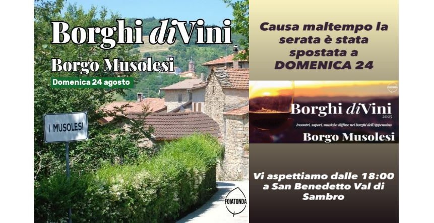 Domenica 24 agosto Borghi diVini torna a Borgo Musolesi (S.Benedetto Vds) con le cantine locali e i loro deliziosi vini