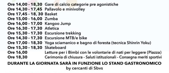 Un pomeriggio di festa, ricco di esibizioni, iniziative sportive ed anche culturali, che vedranno coinvolte le nostre numerose Associazioni, con le quali chiuderemo questa stagione sportiva, preparandoci per la prossima, sempre all’insegna dello “STARE BENE INSIEME”.