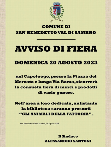 Domenica 20 agosto si terrà a San Benedetto Val di Sambro la tradizionale fiera annuale, un appuntamento per gli appassionati di mercati. Una ampia offerta che varia dai prodotti agricoli a quelli gastronomici, dall’abbigliamento agli strumenti agricoli fino agli oggetti di piccolo artigianato, con una particolare predilezione per i prodotti locali, che in questa occasione trovano una vetrina rilevante.