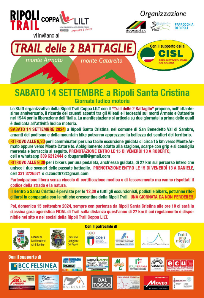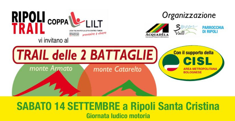 L’annuale manifestazione della Ripoli Trail Coppa LILT (Lega Italiana per la Lotta contro i Tumori) quest’anno è denominata “Trail delle 2 Battaglie”. Si commemorano infatti i sanguinosi scontri tra Alleati e tedeschi nel 1944 sui Monti Armato e Catarelto, ovvero sui territori di San Benedetto Val di Sambro e di Castiglione dei Pepoli.