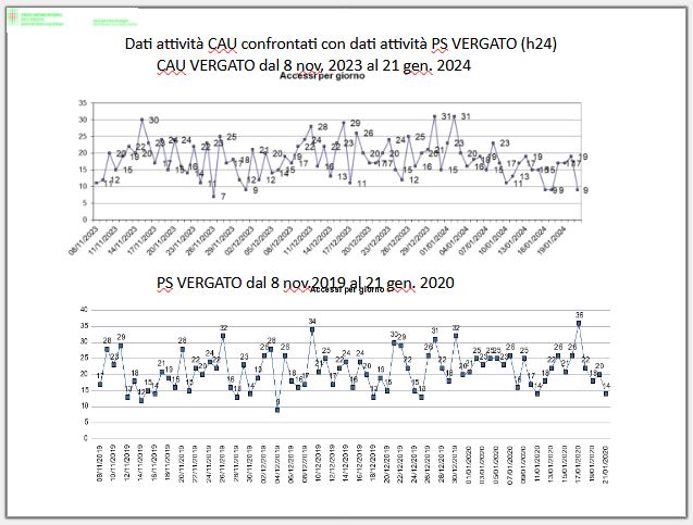 • ▪  il CAU di Vergato ha visto, dall’8 novembre 2023 al 21 gennaio 2024, 1363 accessi totali, contro i 1584 del PS nello stesso periodo tra l’8 novembre 2019 e il 21 gennaio 2020. Gli accessi diurni sono stati pari all’89%, contro il 79% del 2019-20; quelli notturni l’11% contro il 21% del 2019-20;