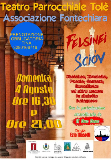 Dopo il gradito successo per le iniziative teatrali e culturali che stanno riempiendo le serate estive nel teatro parrocchiale, domenica 4 agosto andrà in scena la rappresentazione teatrale della compagnia dialettale FELSINEI con la regia di Ezio Maselli.