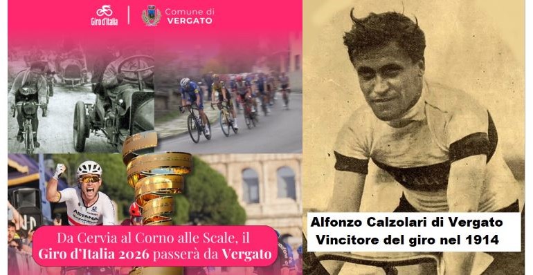 Per Vergato il passaggio del Giro assume un valore particolarmente simbolico e affettivo. Il Comune è infatti legato in modo profondo alla storia del ciclismo italiano grazie alla figura di Alfonso Calzolari, nato a Vergato il 30 aprile 1887 e vincitore del Giro d’Italia 1914. Un’edizione entrata nella leggenda per le condizioni estreme, tra neve, fango e tappe durissime, come la celebre Lucca–Roma di 430 chilometri. Calzolari trionfò con un distacco impressionante di 1 ora, 55 minuti e 26 secondi sul secondo classificato, un record mai più eguagliato nella storia della corsa rosa. Negli anni, le Amministtazioni comunali hanno continuato a custodire e valorizzare questa eredità sportiva, ricordando il proprio campione con iniziative culturali e commemorative: dal centenario della maglia rosa celebrato nel 2014 fino alla giornata dedicata a Calzolari nel giugno 2024, culminata con l’inaugurazione di un’opera a lui dedicata e realizzata dall’artista Gianluca Boschi.