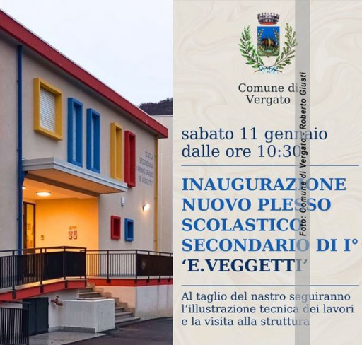 L’Amministrazione comunale di Vergato informa che sabato 11 gennaio 2025, a partire dalle ore 10:30, si terrà l’inaugurazione, con apertura al pubbblico, del nuovo plesso scolastico secondario di I^ grado “E. Veggetti”, sito in via A. Moro 10 a Vergato.