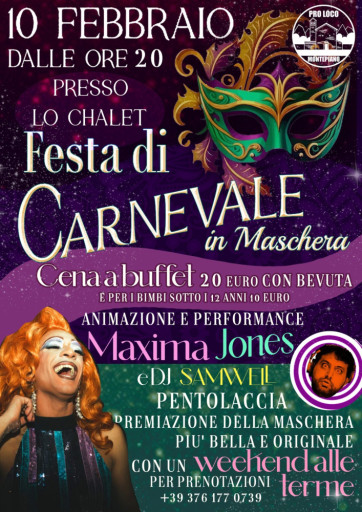 10 febbraio ore 20. Eccezionale Festa di Carnevale alla Chalet di Montepiano con ricchi premi, giochi cena a buffet. Vedi localdina