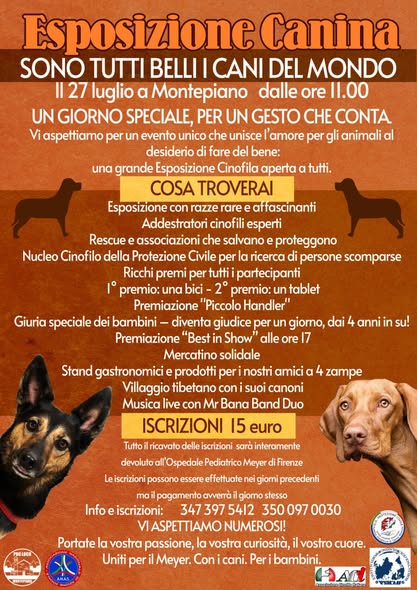 Un’intera giornata dedicata ai nostri amici a quattro zampe, all’amore per gli animali e alla solidarietà presso gli spazi esterni della Pro Loco di Montepiano, via della Badia 44. Tutto il ricavato sarà devoluto all’Ospedale Pediatrico Meyer di Firenze.